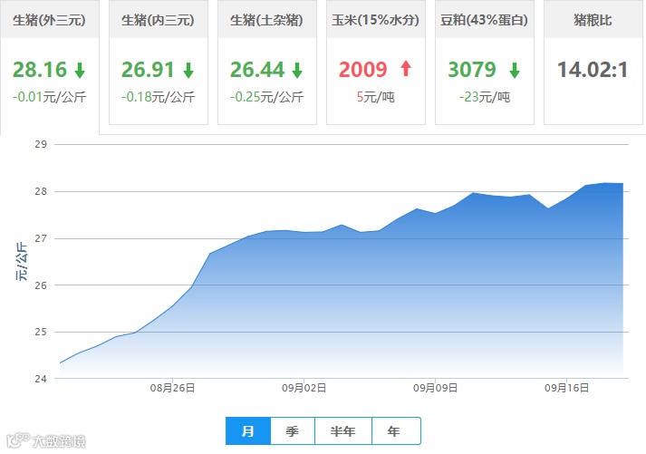 | 地区名称 | 外三元(元/公斤) | 内三元(元/公斤) | 土杂猪(元/公斤) | 玉米(元/吨) | 豆粕(元/吨) |