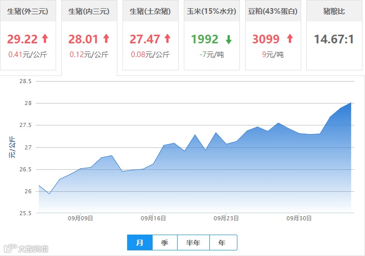 | 地区名称 | 外三元(元/公斤) | 内三元(元/公斤) | 土杂猪(元/公斤) | 玉米(元/吨) | 豆粕(元/吨) |