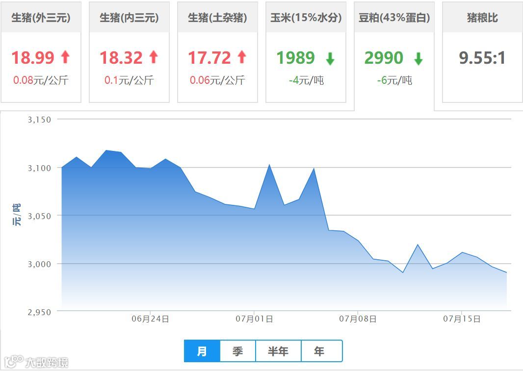 | 地区名称 | 外三元(元/公斤) | 内三元(元/公斤) | 土杂猪(元/公斤) | 玉米(元/吨) | 豆粕(元/吨) |