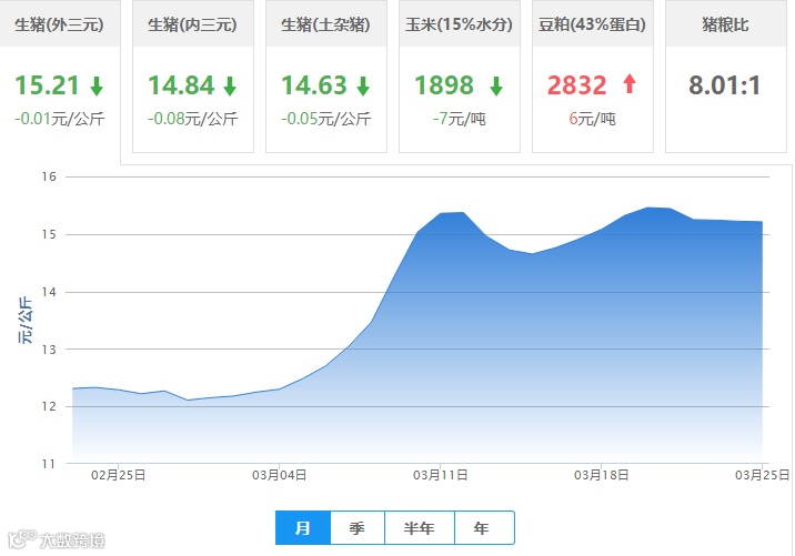| 地区名称 | 外三元(元/公斤) | 内三元(元/公斤) | 土杂猪(元/公斤) | 玉米(元/吨) | 豆粕(元/吨) |