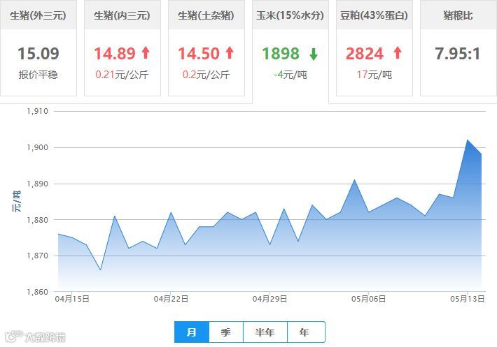 | 地区名称 | 外三元(元/公斤) | 内三元(元/公斤) | 土杂猪(元/公斤) | 玉米(元/吨) | 豆粕(元/吨) |