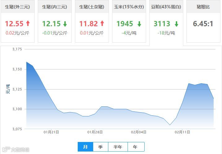| 地区名称 | 外三元(元/公斤) | 内三元(元/公斤) | 土杂猪(元/公斤) | 玉米(元/吨) | 豆粕(元/吨) |