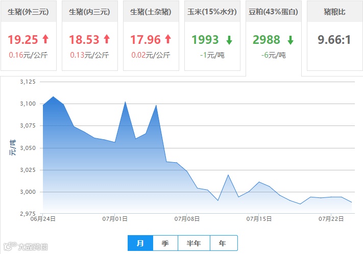 | 地区名称 | 外三元(元/公斤) | 内三元(元/公斤) | 土杂猪(元/公斤) | 玉米(元/吨) | 豆粕(元/吨) |