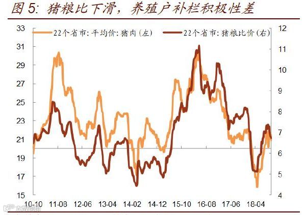 我们中性来估计,假设猪瘟持续1年,那么明显的补库行为可能也要到明年四季度。鉴于母猪的存栏领先猪价大约1年或者比1年略长,那么就意味着猪价可能也得到2020年的后半段才会触顶。2011年和2016年的猪肉价格高峰在30元甚至超过30元/公斤。但在当时,牛羊肉的价格都比现在低,近期牛羊肉的价格持续走高,导致猪肉和牛羊肉的比价下滑。假设牛羊肉高位运行,那么按照比价效应和这一轮猪周期对供给的冲击,我们认为本轮猪周期的价格高点应该是大概率要高于2011年和2016年的高点的。但这个高点应该体现在2020年而不是2019年。不太极端的来假设,如果高点达到30-35元,那么从目前19-20元上涨到高点,累积涨幅在60%-80%,如果从今年5月份的低点16元来算,从低点到高点的涨幅在100%左右。如果有较大部分的涨幅(比如60%的涨幅)体现在2019年,那么对应明年猪肉价格的高点可能在25-26元。明年猪肉价格大体的走势应该是一路走高的,即价格高位可能在四季度。简单推算的话,19年中左右,价格可能在23附近。从基数效应来看,今年猪价的低点在5月份,大致在16元。按照基数形态,明年年中比较可能是CPI的局部高点。按照16到23来测算,猪肉价格的同比在43%左右。即便保守一些,假设明年年中猪肉价格同比的涨幅在30%、35%和40%几种情景,那么考虑到猪肉价格在CPI的权重在2.5-2.8%(假设按照2.7%来算),对应的CPI食品项变动是在2.8%、3.2%和3.7%,再大体对应到食品项的同比大致是6.1%、6.5%和7%。那么,即使考虑到非食品的同比涨幅在经济走弱的情况下降低一些,对应到CPI的同比涨幅可能也会到3.3%-3.6%。