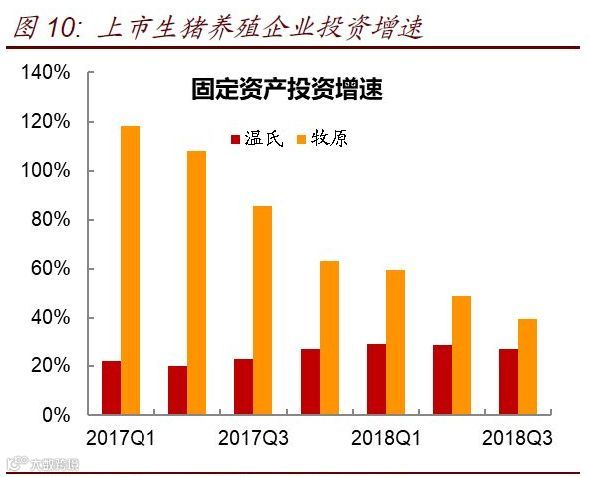 不确定性还可能来自上市生猪养殖企业的扩产意愿。从三季报看,上市生猪养殖企业产能依然在持续扩张,上市猪企产能依然持续扩张,这些大型企业布局广,因此在销区也有补栏,而且对自身的疫情控制能力强。猪瘟引起的猪肉价格波动导致其新产能建设速度略有放缓。温氏、牧原两家龙头养殖企业三季度固定资产投资和在建工程增速较中报继续下降(图10),但生产性生物资产增速有所回升。根据温氏最新的公告,10月生猪销售受到疫情影响有所下降,但同比上升,主要是公司养猪业务规模扩大,商品肉猪出栏量增长所致;而牧原10月生猪销售同比增长80%,环比增长43%,因此,散户养殖加速出清的过程中,上市生猪养殖公司如果扩产争夺市场份额可能会为猪肉供给的紧缩产生一定不确定性。