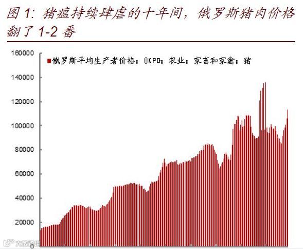 由于非洲猪瘟属于非人畜共患型病毒,猪瘟病毒并不直接侵害人体,因此对于猪肉需求影响还不是很大。供给方面,由于我国散户养殖占比50%左右,疫情阶段性爆发时都会引起养殖户主动抛栏带来的猪肉阶段性供给压力,因而在短期内对猪价形成明显的压制效果。从8月疫情爆发后的猪肉批发价格走势可以看到,猪肉在9月明显上涨后10月开始进入下行通道,除了淡季的原因外,也有养殖户抛售对供给形成的压力。在市场加速出清后,供给收缩将会推动猪肉价格上涨,尤其是南方进入做“腊肉”阶段后。而随着散户的逐渐退出,生猪养殖行业的集中度也将进一步提高,龙头养殖企业的地位将更加牢固。从历史上猪瘟对猪肉价格的影响上看,07年12月,俄罗斯首次披露猪瘟疫情后的一年内,猪肉价格平均上涨36%,而此后猪瘟持续肆虐的十年间,俄罗斯猪肉价格已经翻了1-2番。此外,猪瘟的阶段性爆发也引起猪肉价格剧烈波动。我国非洲猪瘟于18年8月份首次发现,预计也将在散户逐渐退出后推动19年猪肉价格上涨。