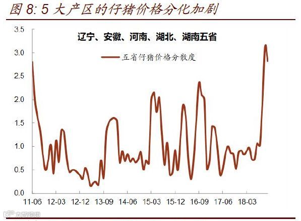 猪粮比在9月以来一路下行,由于统计局公布的能繁母猪存栏数据主要统计农村中小型养殖户的存栏,因此数据失真,我们采用两种方法近似考察产能。一是能繁母猪存栏,由于能繁母猪补栏到生猪出栏有13个月的周期,把能繁母猪存栏偏离其6月移动平均值作为整体存栏的代理,从斜率看能繁母猪去化趋势加速下滑(图3),而这一数值领先生猪出栏/猪价一年左右,所以未来的猪价可能面临较大的涨价。二是从仔猪出售毛利润来侧面衡量能繁母猪存栏(仔猪的数据是周度,更具及时性,而母猪是滞后的月度数据),只有当仔猪出售毛利持续为负的时候,才会出现较大规模的能繁母猪存栏下降。目前部分地区仔猪已经开始亏损,仔猪的养殖毛利持续在0附近,5大产区的仔猪价格分化加剧,超过了前两轮猪周期。自繁自养户对后市悲观已经开始推迟出栏计划,如果仔猪出售毛利继续下滑(图8),后续生猪供应可能因为能繁母猪不足而受限,因此猪价上涨空间较大。