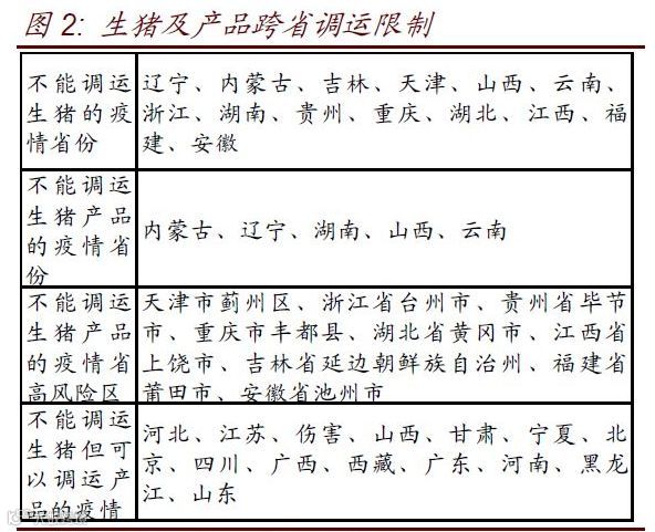 猪瘟非人畜共患,所以杀供给超过杀需求。扑杀去产能其实是小问题,更大的问题在于产区不能外调、持续亏损下能繁母猪存栏的去化。目前仅有山东是唯一未受波及的养猪大省,如果疫情继续扩大,蔓延全国,会进一步淘汰小散养殖户、加速生猪存栏出清;调运受阻情况下,养殖户现金流面临较大挑战,中小养殖户逐步退出市场,非封锁区养殖户补栏积极性下降,禁运政策导致被封锁区产能加速出清、猪价提前触底。短期来看,冬至后的腌腊肉需求带动猪价季节性上涨,叠加生猪调运受阻,南方会出现区域性的供需短缺,南方猪价可能显著上行;中期来看,未来调出省如果出现两起或以上非洲猪瘟疫情,导致白条猪调运亦明显受阻背景下,南方地区供给将进一步短缺。