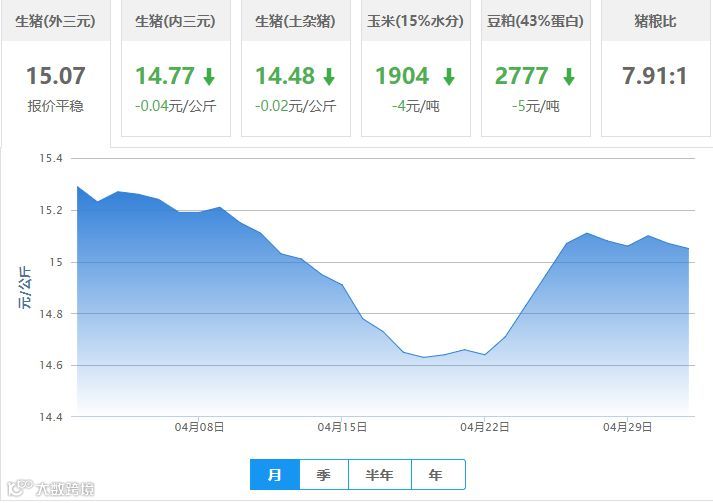 | 地区名称 | 外三元(元/公斤) | 内三元(元/公斤) | 土杂猪(元/公斤) | 玉米(元/吨) | 豆粕(元/吨) |