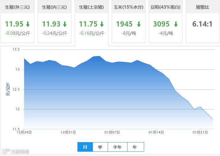 | 地区名称 | 外三元(元/公斤) | 内三元(元/公斤) | 土杂猪(元/公斤) | 玉米(元/吨) | 豆粕(元/吨) |