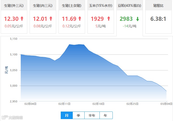 | 地区名称 | 外三元(元/公斤) | 内三元(元/公斤) | 土杂猪(元/公斤) | 玉米(元/吨) | 豆粕(元/吨) |