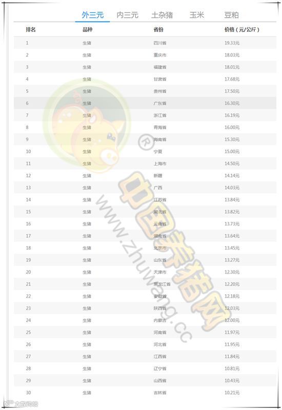 2018年12月9日,据中国养猪网猪价系统监测全国外三元均价为14.20元/公斤,较昨日上涨0.02元/公斤,较上周上涨0.43元/公斤,涨幅维持在0.02-1.80元/公斤,跌幅维持在0.03-1.17元/公斤。