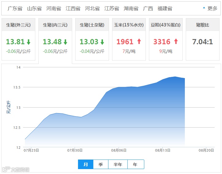 2018年08月21日全国外三元生猪价格行情涨跌表