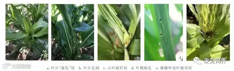 。4-6龄幼虫对玉米的为害更为严重,取食叶片后形成不规则的长形孔洞,也可将整株玉米的叶片取食光,严重时可造成玉米生长点死亡,影响叶片和果穗的正常发育。此外,高龄幼虫还会蛀食玉米雄穗和果穗。