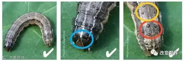 (圆圈分别表示头部倒Y形黄色纵条纹、正方形排列的4个黑斑)如密集时(种群密度大,食物短缺时),末龄幼虫在迁移期几乎为黑色。幼虫共6龄,体色和体长随龄期而变化,低龄幼虫体色呈绿色或黄色,体长6-9 mm,头呈黑或橙色。高龄幼虫多呈棕色,也有呈黑色或绿色的个体存在,体长30-50 mm,头部呈黑、棕或者橙色。