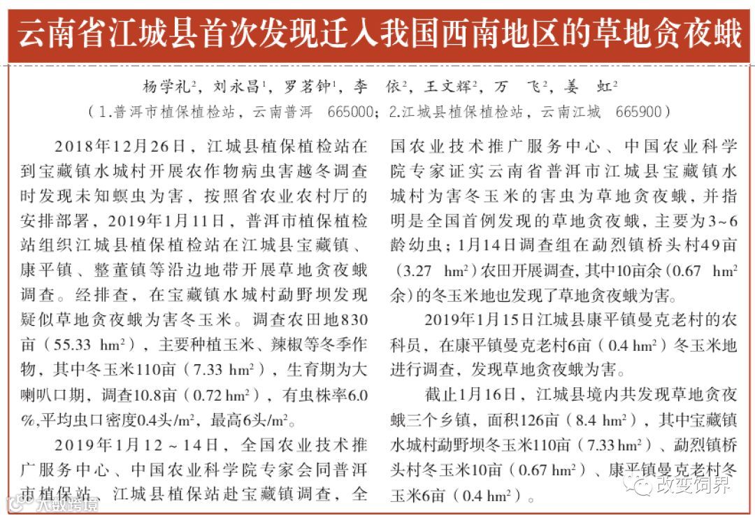 2019年1月11日,云南省普洱市江城县植保人员田间普查第一次发现了草地贪夜蛾幼虫危害玉米
