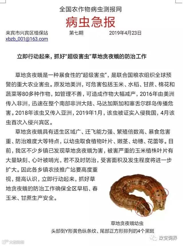 核心要点:此妖蛾子同非洲猪瘟一样,也是源自非洲,特能飞,特能吃,特能生!对粮食作物的破坏力特强!目前云南广东广西已经发现从缅甸入侵的此妖蛾子,预计下一步贵州、海南、湖南、四川、江西、福建可能受影响,6-8月可能集中向东北迁移……尽快转发相关文章到朋友圈,让更多人,尤其是让一线种植粮食作物人员知道并防控!