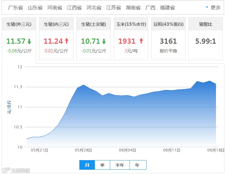2018年06月18日全国外三元生猪价格行情涨跌表