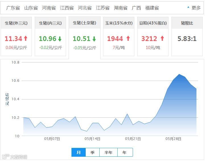 2018年06月01日全国外三元生猪价格行情涨跌表