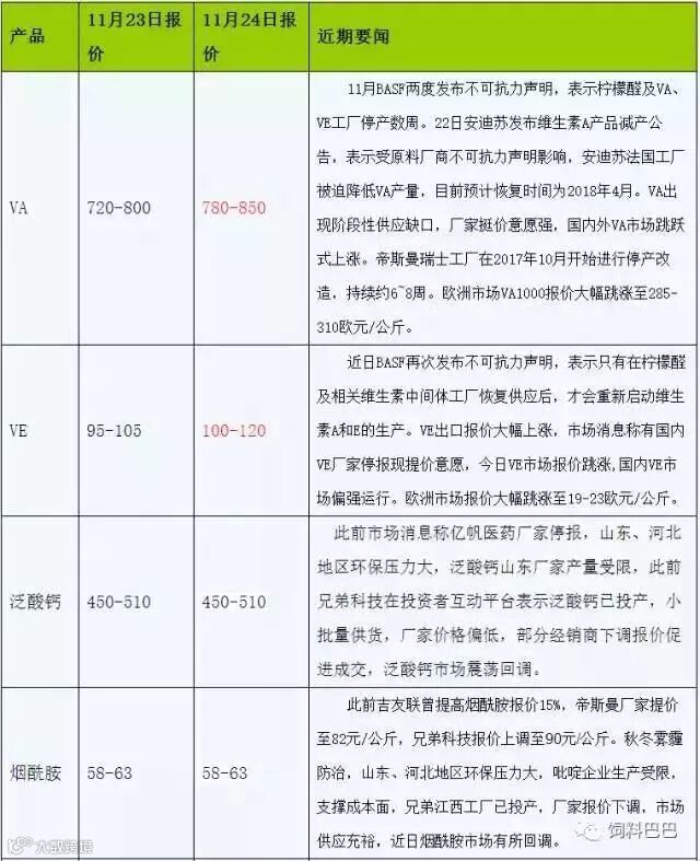 据中国饲料行业信息网数据,11月以来,在之前部分地区饲料价格零星上涨之后,多地饲料企业开始全面上调饲料价格,导致饲料大规模涨价的关键因素就是微量元素、维生素、氨基酸等添加剂以及部分大原料价格的上涨所致,详情如下: