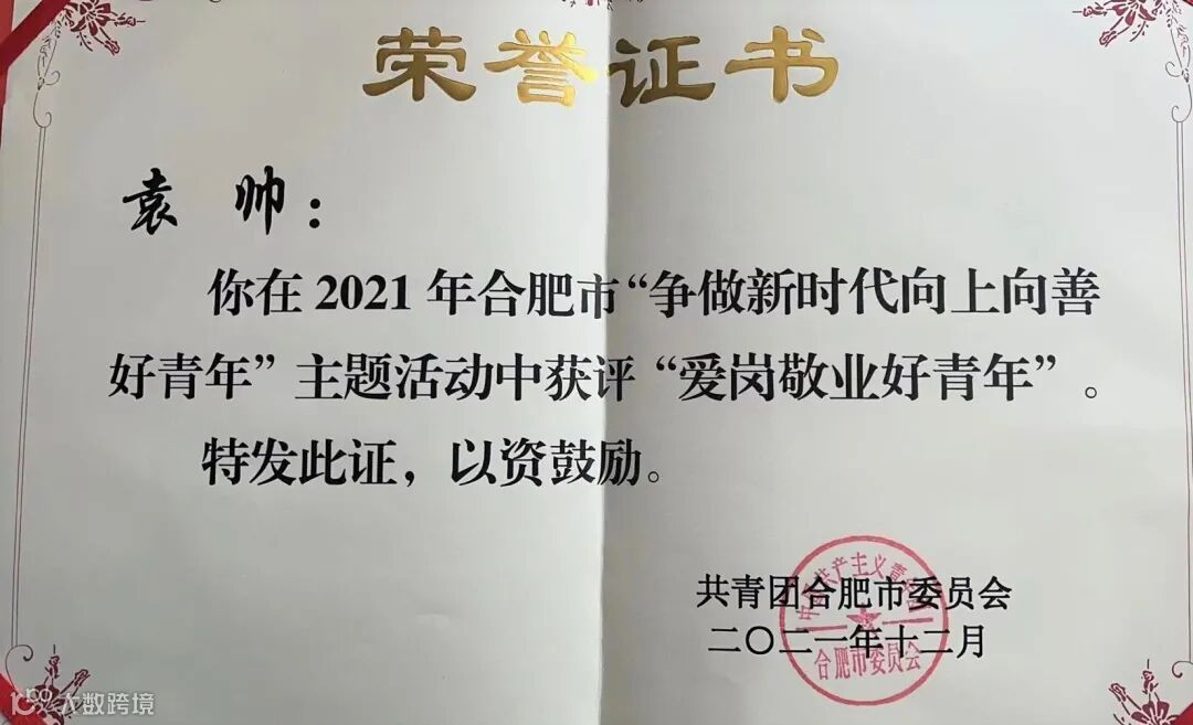 近日,合肥团市委下发文件,公司机加厂青年员工袁帅荣获2021年合肥市“争做新时代向上向善好青年”——“爱岗敬业好青年”称号。