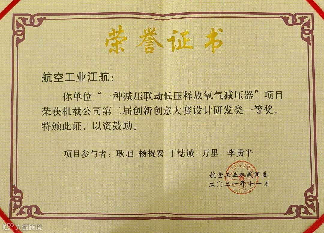 近日,机载团委下发文件,公司“一种减压联动低压释放氧气减压器”青年团队申报的项目荣获大赛“设计研发类”一等奖。