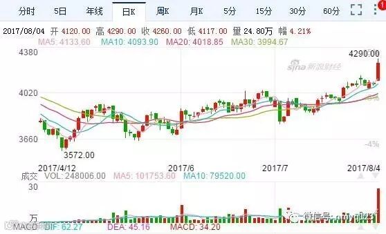 2017年8月4日,国内连盘豆粕震荡下跌。主力1801合约开盘2760元/吨,最高价2774元/吨,最低价2752元/吨,收盘价2768元/吨,收跌0.61%。因降雨提振美国大豆产量前景,周四CBOT大豆期货市场重回弱势振荡收低,主力合约触及一个月低位。