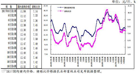 据农业部监测,10 月份生猪价格小幅回落,玉米价格稳中略降,猪粮比价降至 7.44:1,较上月减少 0.07 个点。10 月份全国玉米价格为每 公斤 1.95 元,环比跌 0.6%,同比涨 0.3%;育肥猪配合饲料价 格为每公斤 3.00 元,环比涨 0.2%,同比跌 1.5%。从周价来看,猪粮比价从 2017 年 7月第 4 周 7.12:1 升至 9 月第1 周 7.55:1 后下降,10 月第 4 周降至 7.42:1。