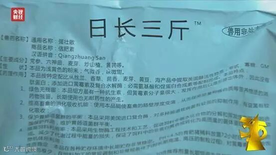 “日长三斤”,是河南漯河宇信科技有限公司的主打产品之一,适用于鸡鸭猪鱼虾等多种动物,产品包装显示,这是一个以党参、六神曲等组成的纯中药制剂,然而公司负责人承认,这里面实际也有西药成分。公司经理张利锋表示,西药就是喹乙醇这些东西,再一个还有二氢吡啶。