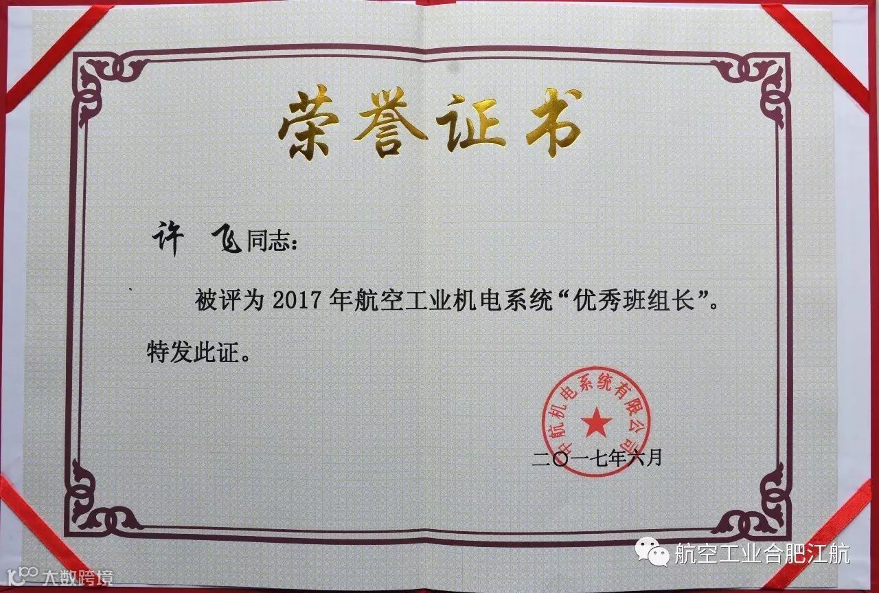 日前,在郑州飞机装备有限公司召开的2017年航空工业机电系统班组建设现场交流会上,公司员工许飞同志被授予机电系统“优秀班组长”称号。