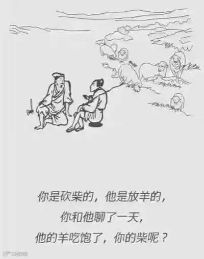 砍柴的和放羊的在一起聊了一整天,夕阳西下,二人起身告辞。这时,砍柴的惊呼了一声:卧槽,我的柴呢?放羊的也惊呼了一声:卧槽,我的羊呢?