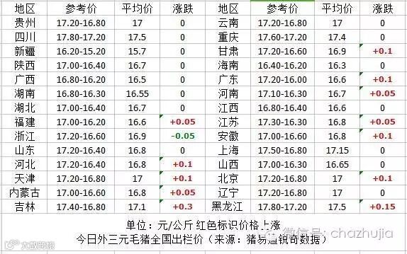 今日在跟踪的28个地区中,全国外三元生猪平均价稳中小幅下跌。分省区来看,上涨地区有黑龙江、吉林、内蒙古、北京、天津、河北、安徽、江苏、福建、河南、广东、甘肃等省(区)市,上涨幅度0.05-0.3元/kg;下跌地区有浙江省,下跌幅度0.05元/kg,其他地区维稳。生猪价格小幅上行,东北、西南猪价居全国高位。