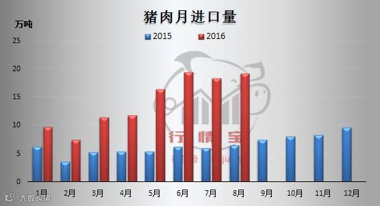 于此同时,进口猪肉量也是有增无减,进一步填补供应缺口。截至 2016年8月份中国进口猪肉进口总量达到113.8万吨,是去年全年进口总量的1.5倍。进口猪肉总量虽然占猪肉消费总量的比例较小,但是能够在短时间内缓解食品企业的供应压力,对养殖户造成心理影响。