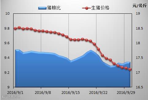 智农通APP·行情宝数据监测显示,9月份全国外三元生猪价格呈连续下跌态势,整体相对8月有较大幅度下跌。至9月27日,全国外三元生猪均价为17.36元/公斤,与去年同期基本持平。9月最高价为9月1日的18.49元/公斤。中秋节对猪价未能起到提振作用,节后猪价加剧下跌。玉米价格9月也呈现下跌态势,使养殖成本有所下降,因此9月份生猪自繁自养盈利水平基本稳定,略有下降。