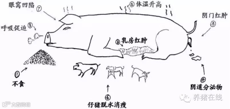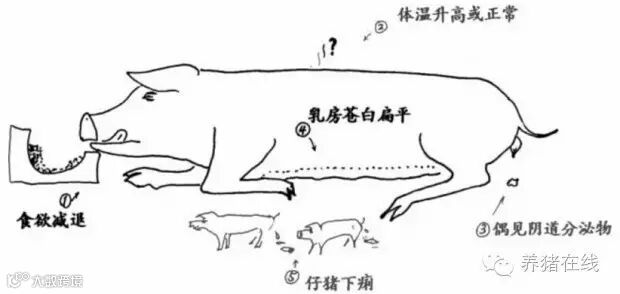 本症常在产后12小时至2~3天内发生。母猪呈病态,食欲减退,分泌少许乳汁或无乳,乳房肿胀、发热和稍有痛觉。乳房内的实质感觉坚硬。母猪常以胸部着地躺下,不让仔猪吮吸。此病持续大约3天。母猪虽能恢复,但仔猪多已饿死。