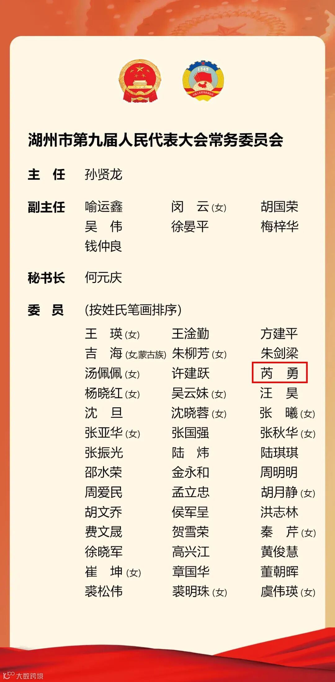 4月15日,湖州市九届人大一次会议举行第三次全体会议,依法选举产生了市九届人大常委会主任、副主任、秘书长、委员;市人民政府市长、副市长;市监察委员会主任;市中级人民法院院长、市人民检察院检察长。大会选举美欣达集团总裁、市九届人大代表芮勇等42人为市九届人大常委会委员。