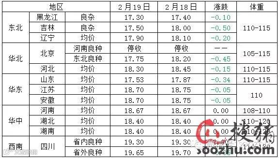 soozhu观点:今日,国内各地养殖户收购玉米到场平均价为1.98元/公斤,较昨日(2月18日)上涨0.02元/公斤(以上价格均已换算成含水分为14%的标准玉米)。今日国内玉米价格整体较为稳定,东北地区玉米价格收临储玉米收购的支撑,价格小幅上涨,黑龙江、吉林、辽宁地区养殖户收购的玉米到场价格上涨0.1元/公斤左右。