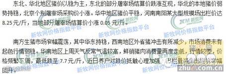 当前全国部分地区外三元生猪主流出栏价:华北猪价7.95元/斤-8.05元/斤,西南猪价8.0元/斤-8.2元/斤,河南猪价7.85元/斤-8.05元/斤,广东四会猪价7.75元/斤-7.95元/斤,福建龙岩猪价7.7元/斤-7.9元/斤。 11月12日生猪市场行情较昨日猪价继续小跌,其中贵州省最高,生猪均价报8.35元/斤;广东省最低,生猪均价报7.8元/斤。 供需两方博弈再现,养户对继续跌价有较强抵触心理,在消费未见明显利好的情况下,新牧网猪价指数分析部评估短期内全国猪价维持弱稳态势。建议广大养殖企业保持出栏节奏,按时出栏,保证收益 |