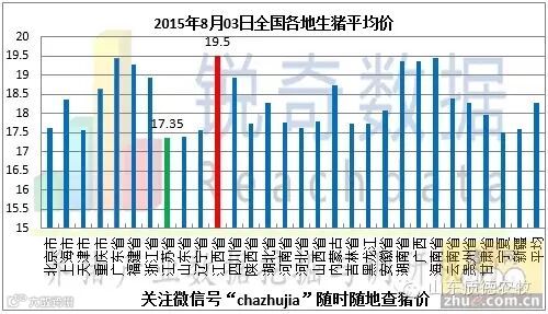 8月03生猪市场行情较昨日震荡上调,全国生猪价格最高地区为江西省,生猪平均价为19.50元/千克(查猪价或报猪价尽在http://bj.zhue.com.cn,手机也可直接访问),最低地区为江苏省,生猪平均价为17.35元/千克,两地区差异非常明显,全国大部分地区生猪行情震荡调整。