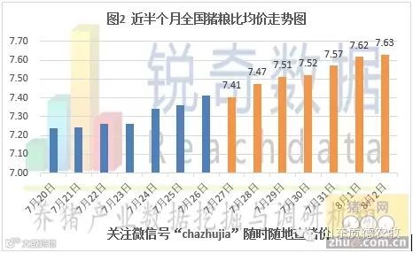 据猪e网锐奇数据监测的当地生猪报价信息统计,2015年08月03日全国各省生猪平均价格为18.27元/千克,与昨日猪价持平(查猪价或报猪价尽在http://bj.zhue.com.cn,手机可直接访问);较上周同期猪价(7月27日)上涨0.51元/千克,涨幅为2.87%(见图1)。今日猪粮比为7.63:1,较昨日猪粮比上涨0.01,涨幅为0.15%;较上周同期猪粮比(7月27日)上涨0.22,涨幅为2.92%(见图2)。