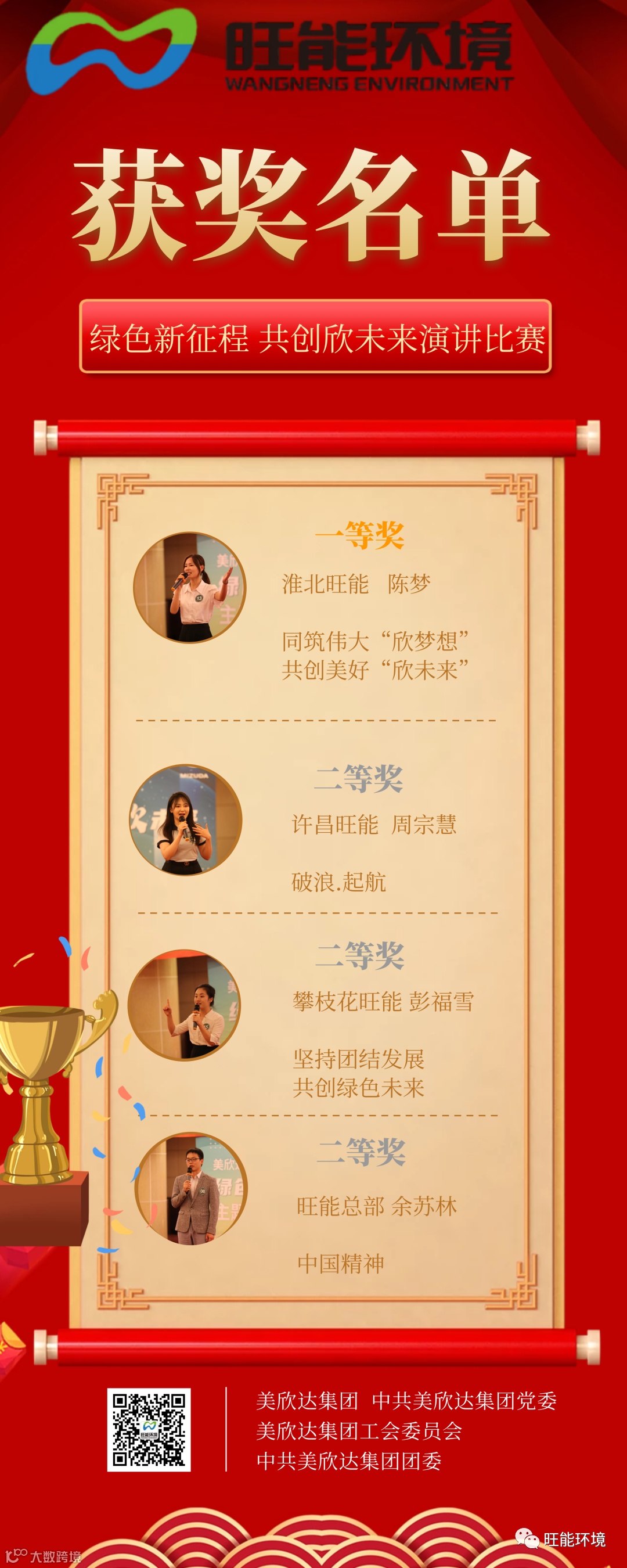 旺能环境经过大力宣传动员、精心组织,通过个人自荐和公司推荐,最终选派4名来自4个省份的实力派演讲者参赛,他们经过无数个日日夜夜的训练打磨,终于不负众望:旺能承包了整场比赛的前四名!