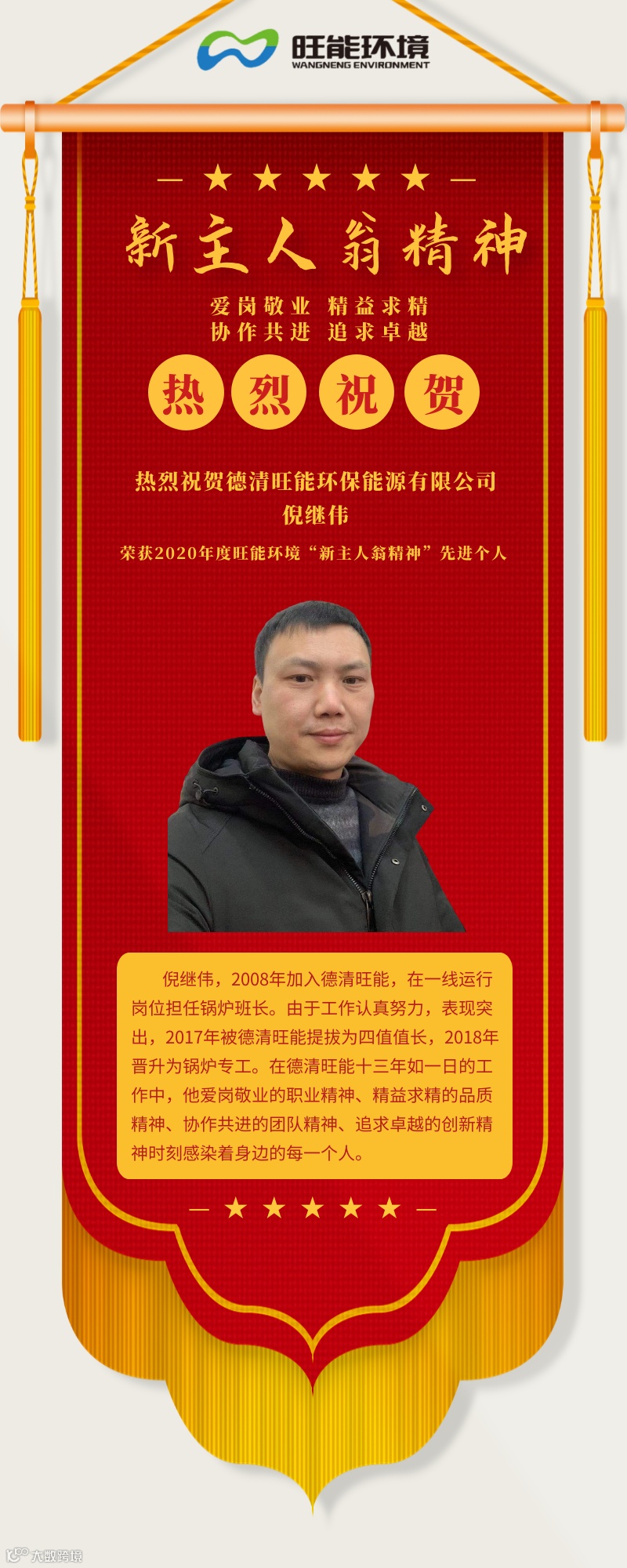 未来,他将继续砥砺奋进,为德清旺能实现追逐”碧水蓝天之“绿叶”的蓝图愿景而不懈奋斗。