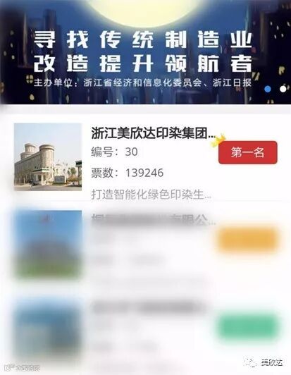 请大家点击“阅读原文”进入投票页面,关注微信“涌金楼”后,给美欣达印染投出宝贵一票!