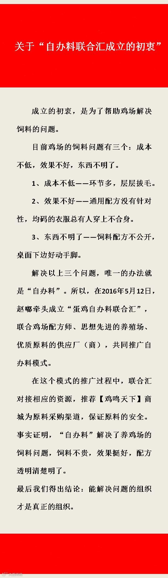 蛋鸡自办料联合汇,是兆督农牧携兄弟公司共同打造的兆督® 自办料服务系统,立足蛋鸡行业站在养殖户立场上的服务系统。甄选行业优质资源,服务终端大小养殖场,追求饲料自由和致力品质鸡蛋打造,降本增效;为行业增信赋能,将蛋鸡行业与互联网结合造福社会。