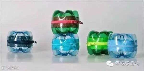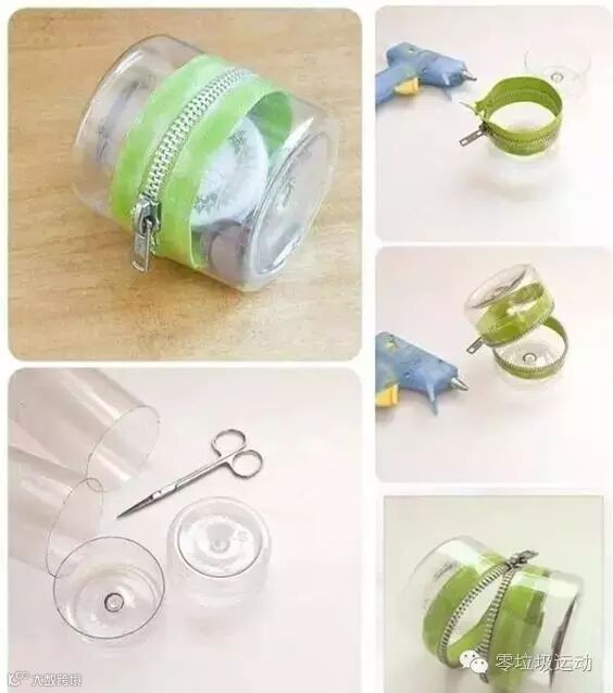 将两个塑料瓶的瓶底剪下来,用热熔胶或502,把拉链粘在两个瓶底里面,然后剪去多余的拉链,也可以当做存钱筒哟!