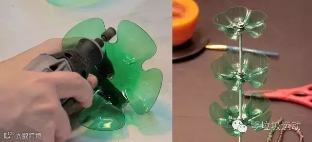 剪下3~4个塑料瓶瓶底,在瓶底的正中间钻孔,用铁棍穿过瓶底,拧上螺丝钉以固定瓶底位置。
