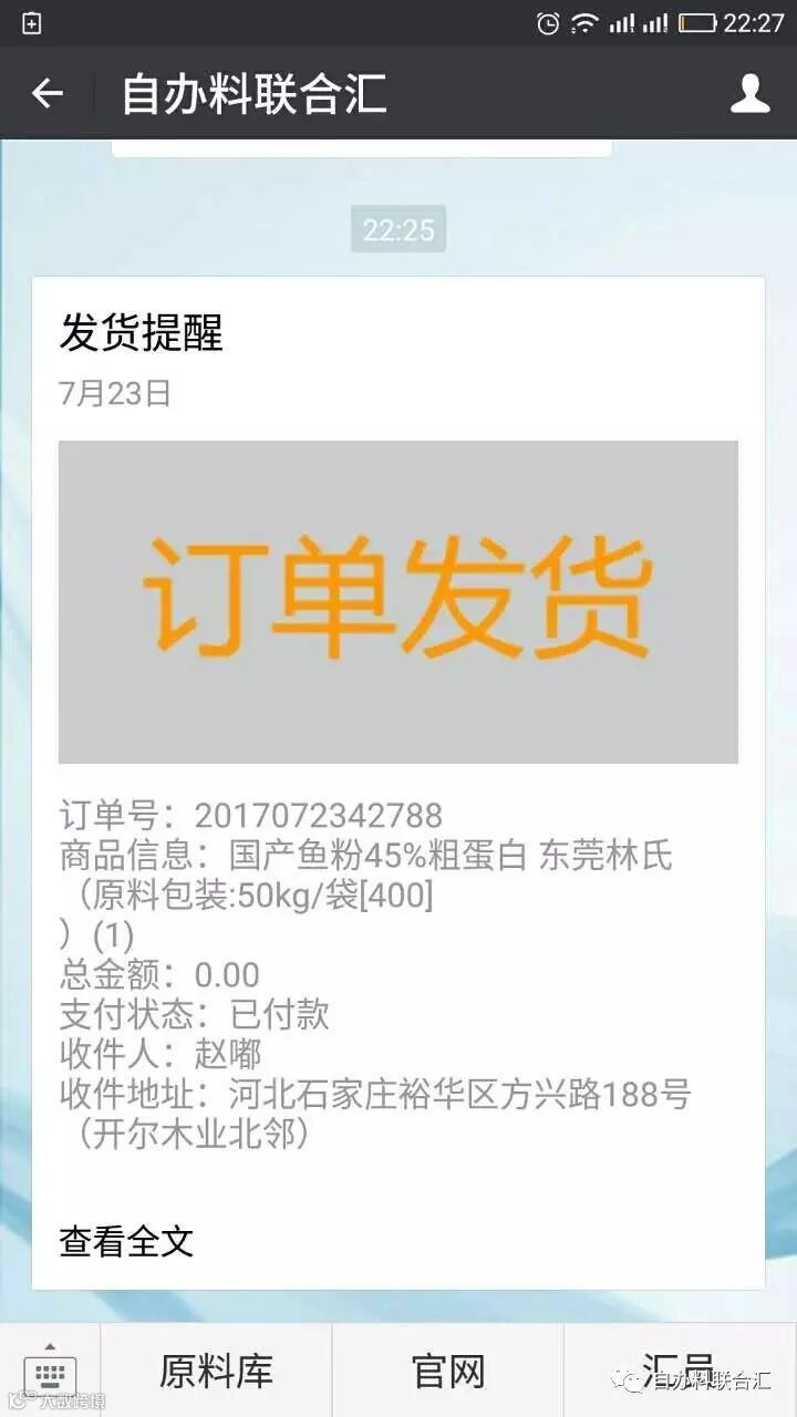 绑定公众号之后,原料库可以给我们发订单动态信息,如图显示“订单发货”