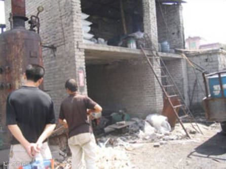 板材加工基地板厂林立不奇怪,但让记者奇怪的是在当地熬胶的作坊也同样众多。景家屯村南,一个个小院引起了记者的注意。一个院子里有一个烟筒,一座两层、只有三面墙的小房子,圆形物体贯穿房子两层,但这里并不是板厂。一村民告诉记者,这是胶厂,熬制脲胶(脲醛胶在当地人被简称为脲胶,下同)的企业,烟筒下面是锅炉,圆形物体为胶罐。记者粗略地数了数,不到100米的路两边,这样的胶厂超过了10家。记者随机走进一家胶厂,三个工人正围在一起聊天,见有陌生人靠近,他们露出警惕的眼神。在记者道出自己是要买胶时,他们才显得放松一些。一阵沟通后,记者成了他们的聊友,见他们没了警惕,记者把话引向正题。“村里有多少胶厂?”记者问道。“有四、五十家吧。”“看怎么算了?”还没等同伴说完,另一工人把话抢了过去。“现在大的板厂都有自己的胶厂,如果再加上单纯熬胶的四、五十家,那这的胶厂可多了去了,数不清。”