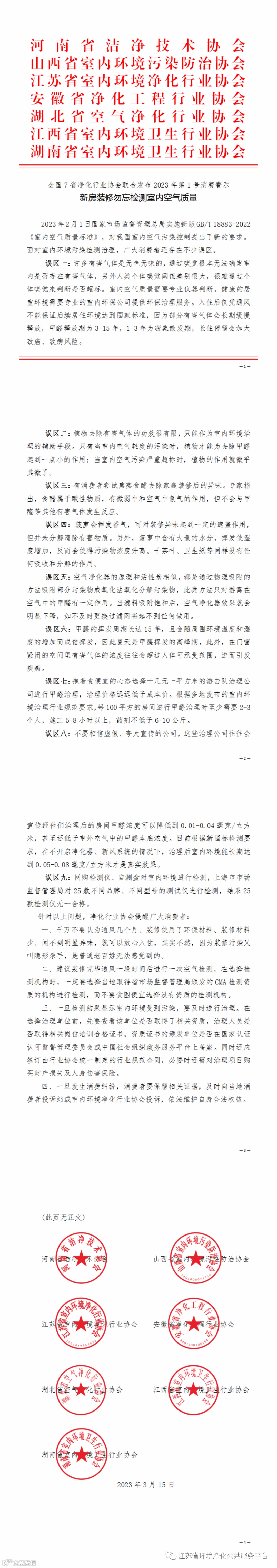 装修行业问题也是层出不穷,装修污染引起的危害案件屡见不鲜,为更好地帮助装修业主规避健康风险,保护消费者合法权益,此前,由江苏省室内环境净化行业协会、河南省洁净技术协会、山西省室内环境污染防治协会、湖南省室内环境卫生行业协会、湖北省空气净化行业协会等7省净化行业协会联合发布2023年第1号消费警示如下: