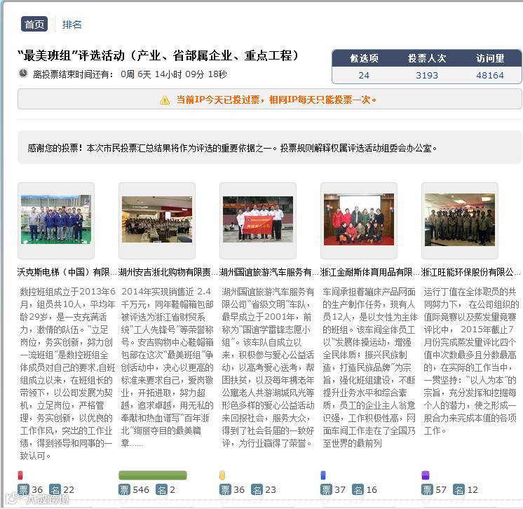 今年五月起,中共湖州市委宣传部和湖州市总工会组织开展了争创“最美班组”、争当“最美工人”的活动。前段时间,我们已经进行了“最美工人”的评选活动。接下来,我们将进行“最美班组”候选对象的评选。经过个人自荐、群众举荐、组织推荐、相关部门审核和组委会评选,目前已经确定了49组候选团体。即日起,大家可以通过添加微信“湖州工会”,选出心中的“最美”。投票时间为7天,每人每次限投5票,最终将产生票数较高的团体20组。本次市民投票汇总结果将作为评选的重要依据之一。投票规则解释权属评选活动组委会办公室。